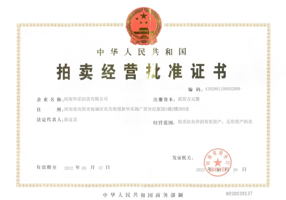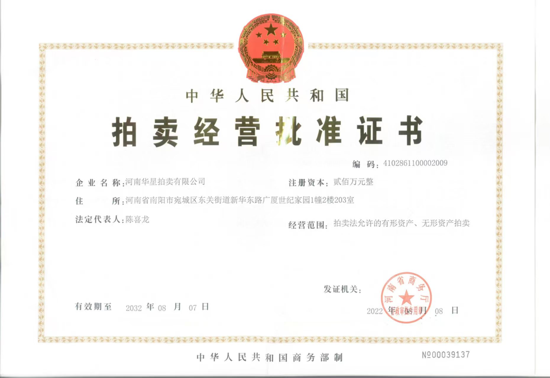 2013年7月取得南陽(yáng)市人民政府指定、河南省財(cái)政廳頒發(fā)河南省公物拍賣(mài)資格證書(shū)