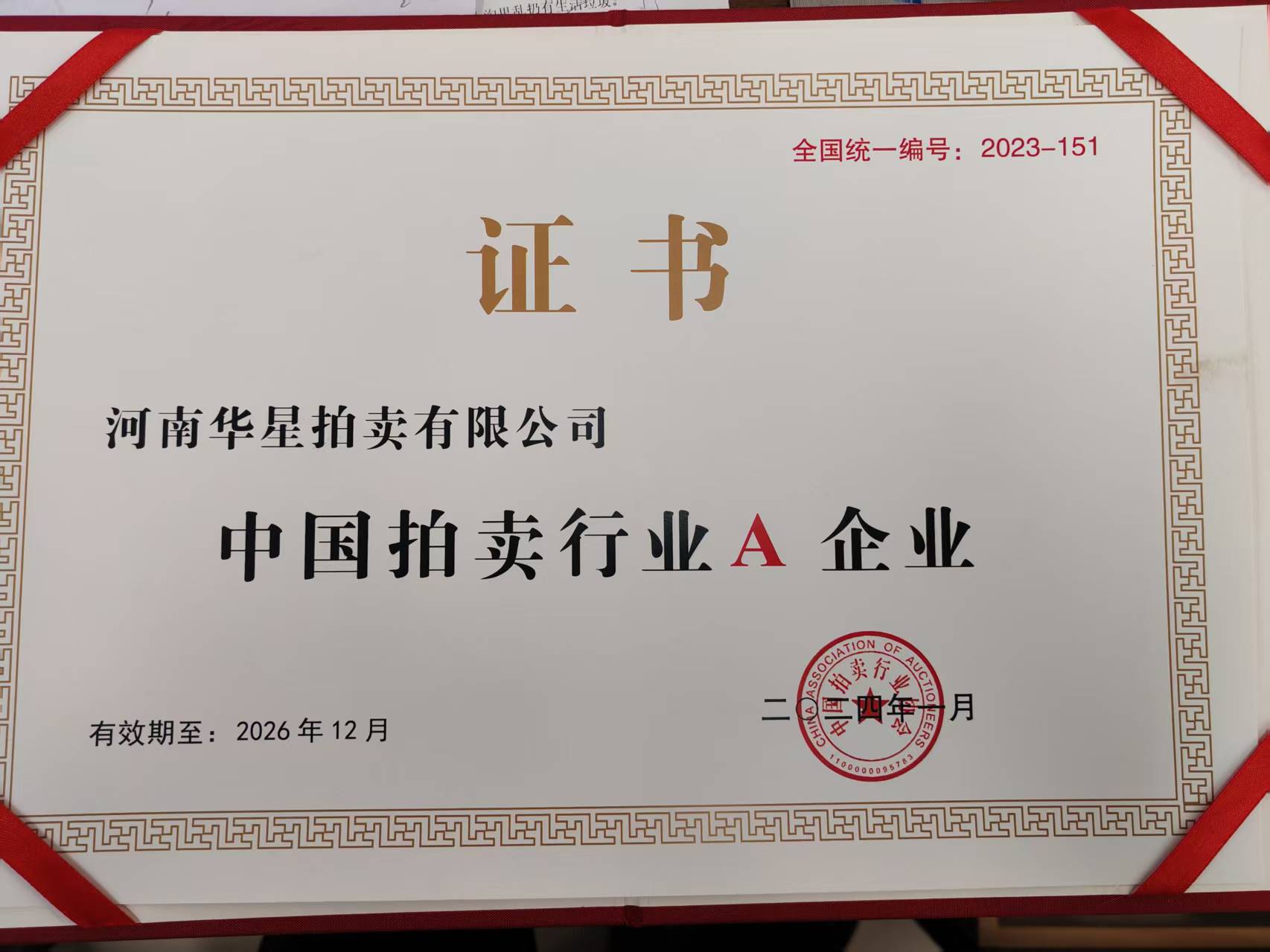 2023年12月我公司經(jīng)中拍協(xié)全國(guó)拍賣(mài)企業(yè)等級(jí)評(píng)估工作辦公室評(píng)為A級(jí)企業(yè)