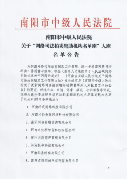 2025年1月入圍南陽(yáng)市中級(jí)法院“網(wǎng)絡(luò)司法拍賣(mài)輔助機(jī)構(gòu)名單庫(kù)”